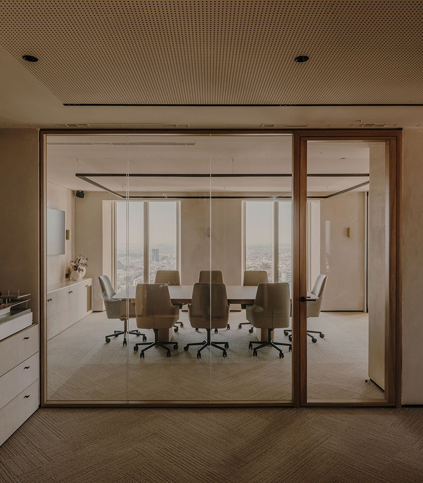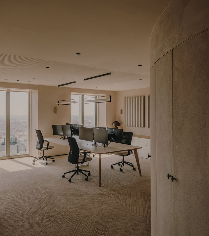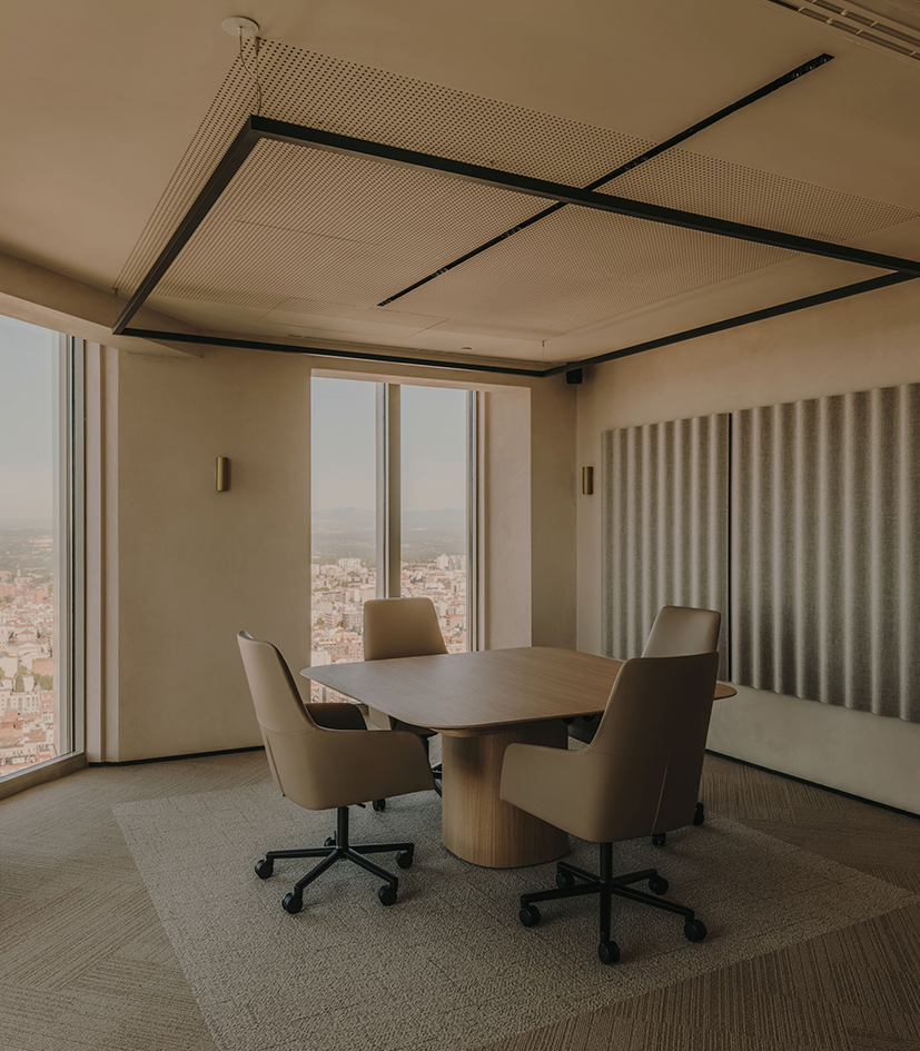 La elección de una tonalidad beige claro no es casualidad: este color genera un entorno sereno y equilibrado, ideal para fomentar la concentración de sus empleados. Además, su capacidad para reflejar la luz natural permite aprovechar al máximo los imponentes ventanales, realzando la amplitud del espacio.
