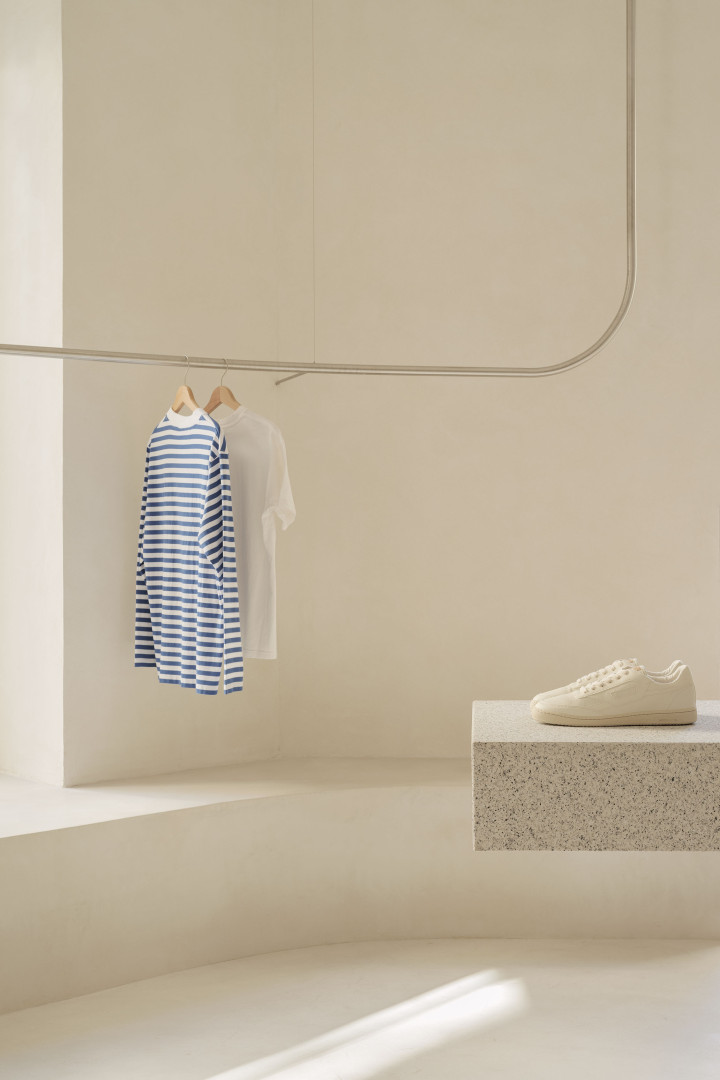 Blue Banana es una firma de ropa centrada en la aventura, la sostenibilidad y el descubrimiento. La selección cromática de la marca, que predomina en todas sus tiendas, se compone de matices azules y blancos, elegidos para encarnar dichos valores. El local de la Calle Fuencarral 47 en Madrid ha sido pintada respetando esta paleta; las paredes están bañadas en un azul ultramar profundo, creando así un espacio que hace destacar la viveza de su colección de prendas.