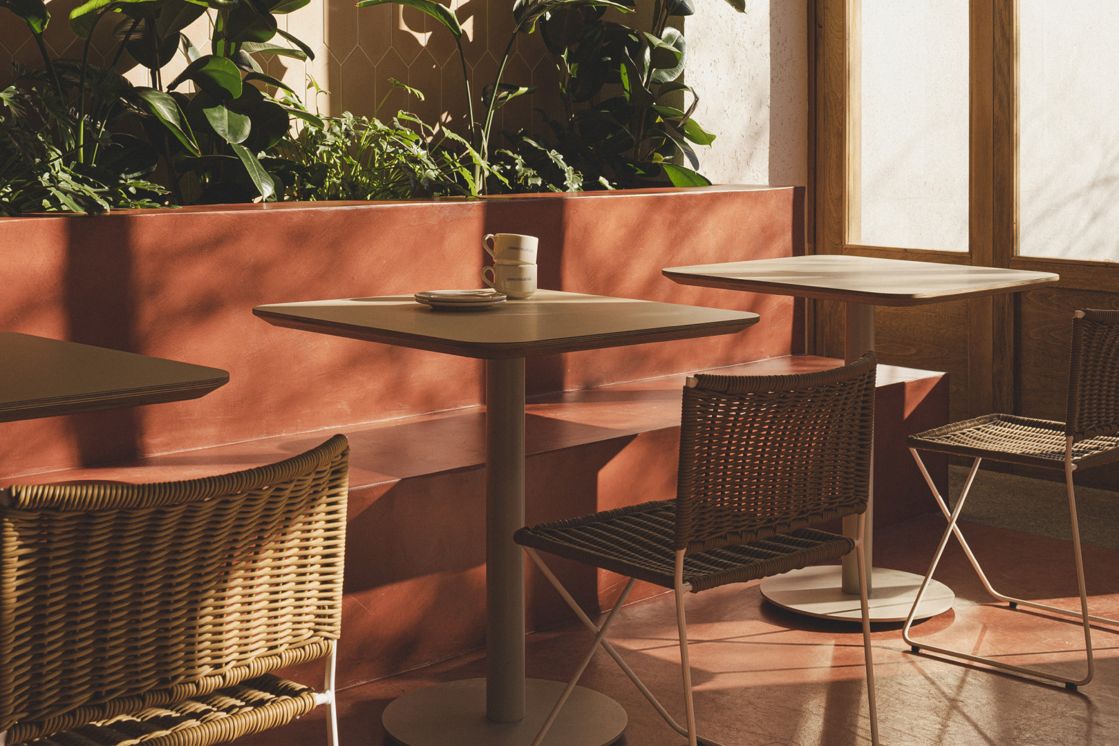 Este establecimiento se distingue por su enfoque minimalista y por su compromiso con la sostenibilidad, tanto en la oferta de café como en la selección de productos. La decoración interior se ha concebido bajo una paleta de colores neutros, destacando el uso del mortero a la cal que evoca sensaciones de confort y serenidad, contribuyendo a la creación de un espacio sumamente acogedor. Este último matiz se complementa con elementos orgánicos como la madera que existe por la tienda y la vegetación.